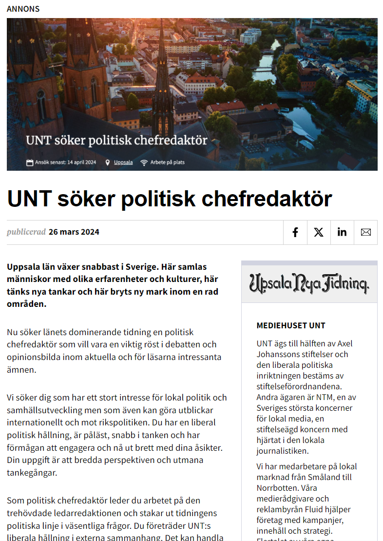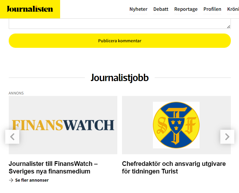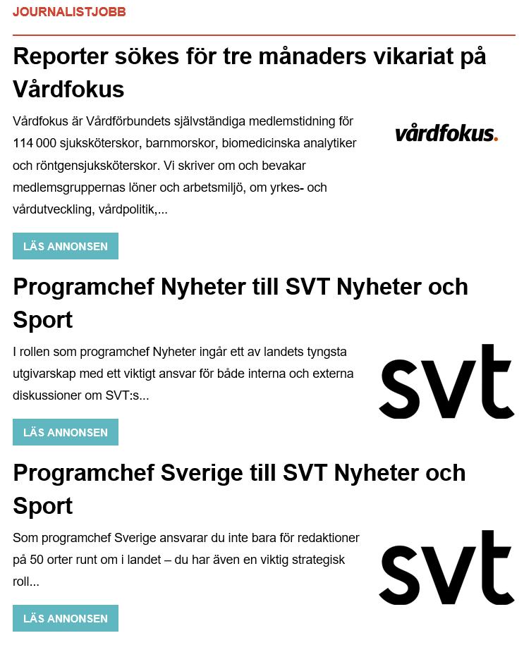 - Publicering med text, logotyp, bild, video och länk på Journalistjobb. Platsannonserna visas också på förstasidan och under alla artiklar på journalisten.se. Sajten har cirka 240 000 sidvisningar och 120 000 unika besökare per månad.