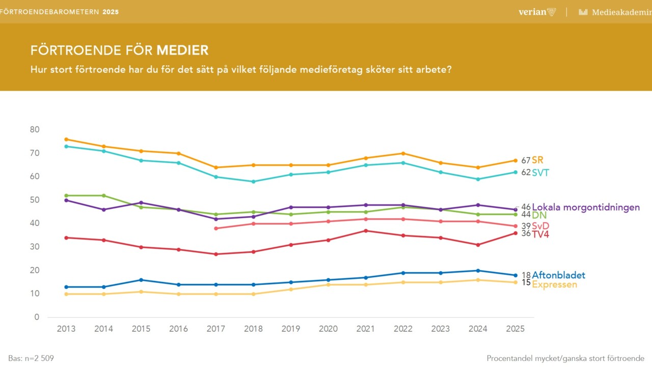 Förtroendet för medierna sjunker. Public service fortsätter att ligga på toppen men även de drabbas av raset. Vilka ansvariga utgivare känner ett långsiktigt ansvar för att höja allmänhetens förtroende för våra medier? Inte många vill jag hävda. Alla har sina karriärer att tänka på. Lösningen på förtroendeproblemet är inte att inskränka yttrandefriheten med nya lagar. Det är dock allt mer uppenbart att våra medier är i akut behov av en grundlig etisk diskussion. Allmänheten har sagt sitt – argumenten för att rättfärdiga högst tvivelaktiga arbetsmetoder och publiceringar håller inte.