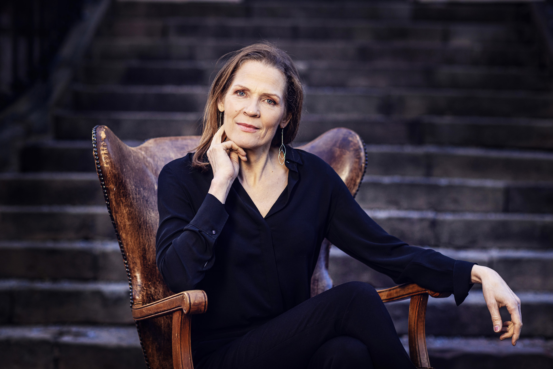 Åsne Seierstad tar plats i en stol på uppfarten till förlagets Stockholmskontor. Foto: Tor Johnsson.